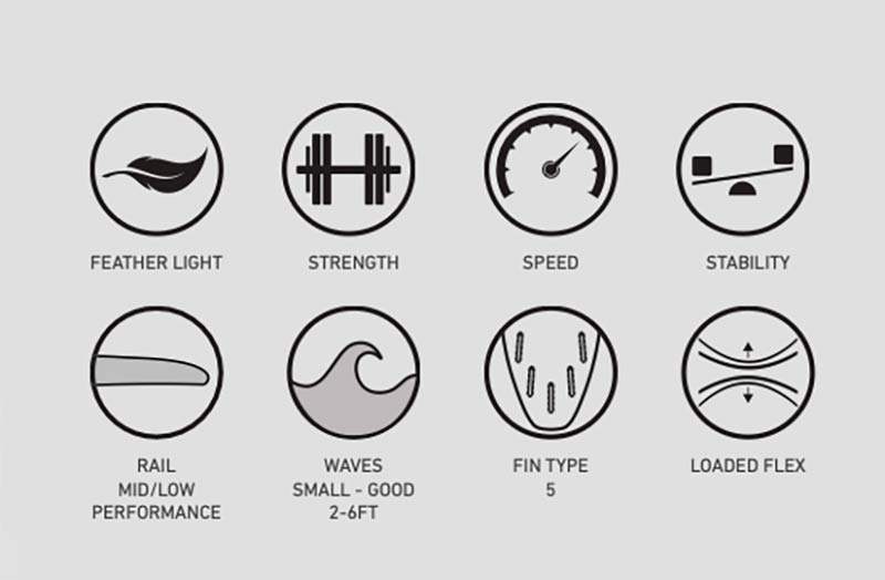 Helium core construction excels at generating speed in weak, everyday waves. It’s a 0.8 EPS foam core with flex controlled at the rails made from wood.