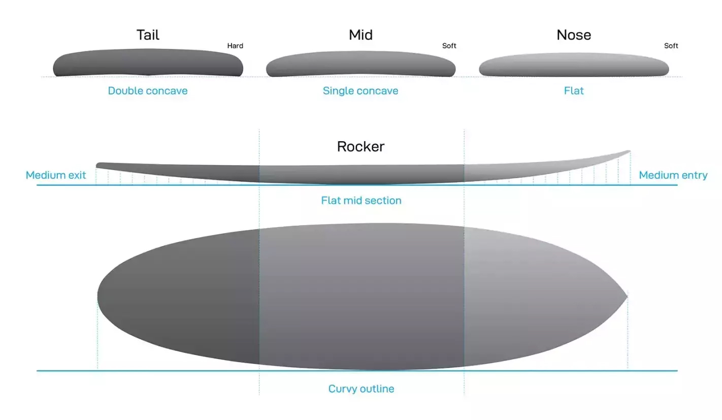 • Performance rails, bottom rocker to make it fast, stable and maneuverable on