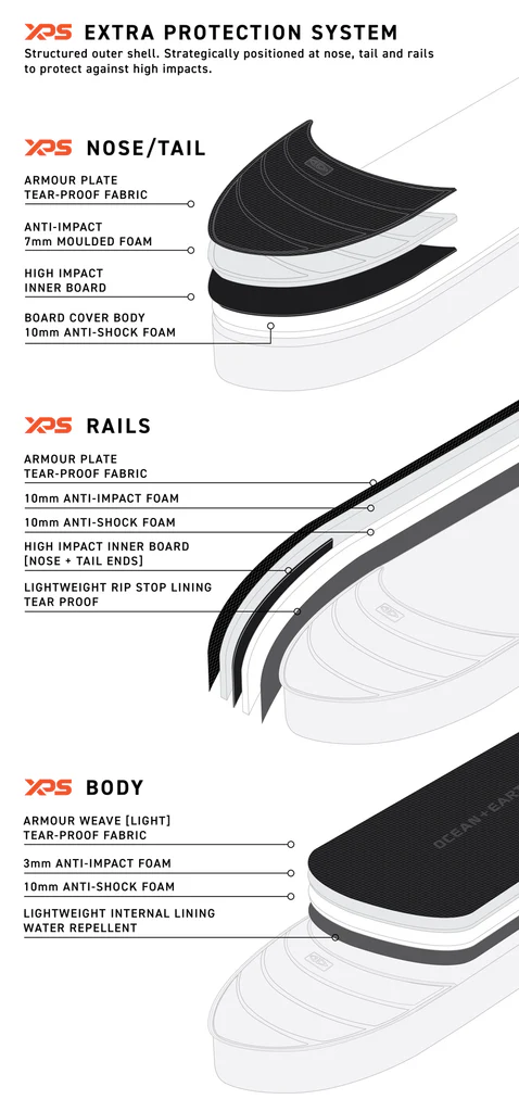 Embrace the future of surfboard protection with our innovative APEX , 'XPS-IPS' protection systems, incorporating a structured external shell (XPS) for high- impact defence and internally positioned cushioning pads and compression straps (IPS) designed to cradle and safeguard your boards, instilling a lifetime of trust.