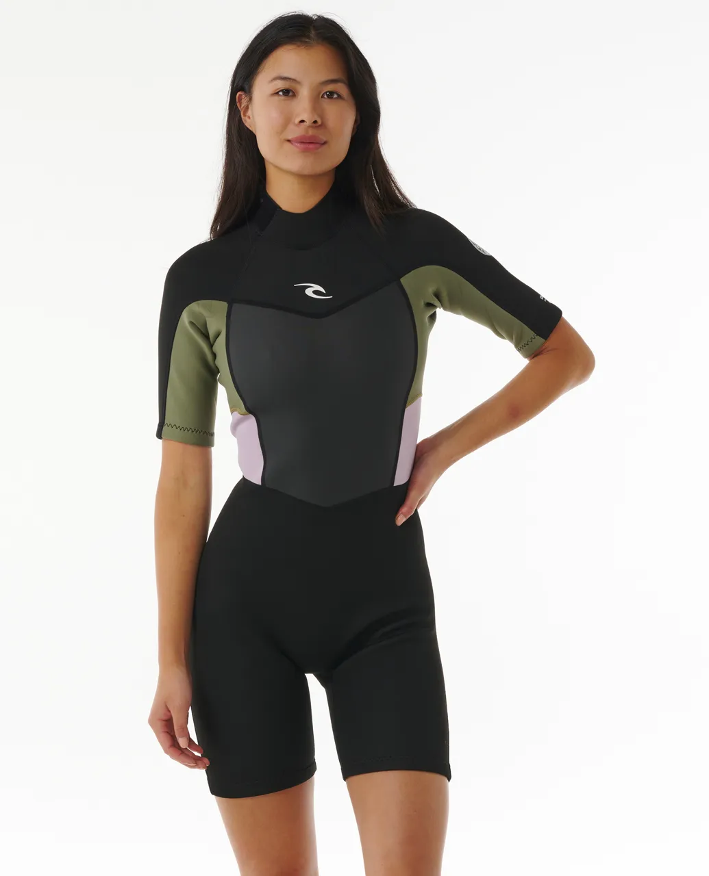 This short-sleeve springsuit offers optimal comfort and flexibility, featuring durable neoprene material, a back zip closure, and a sleek, color-blocked design for water adventures.