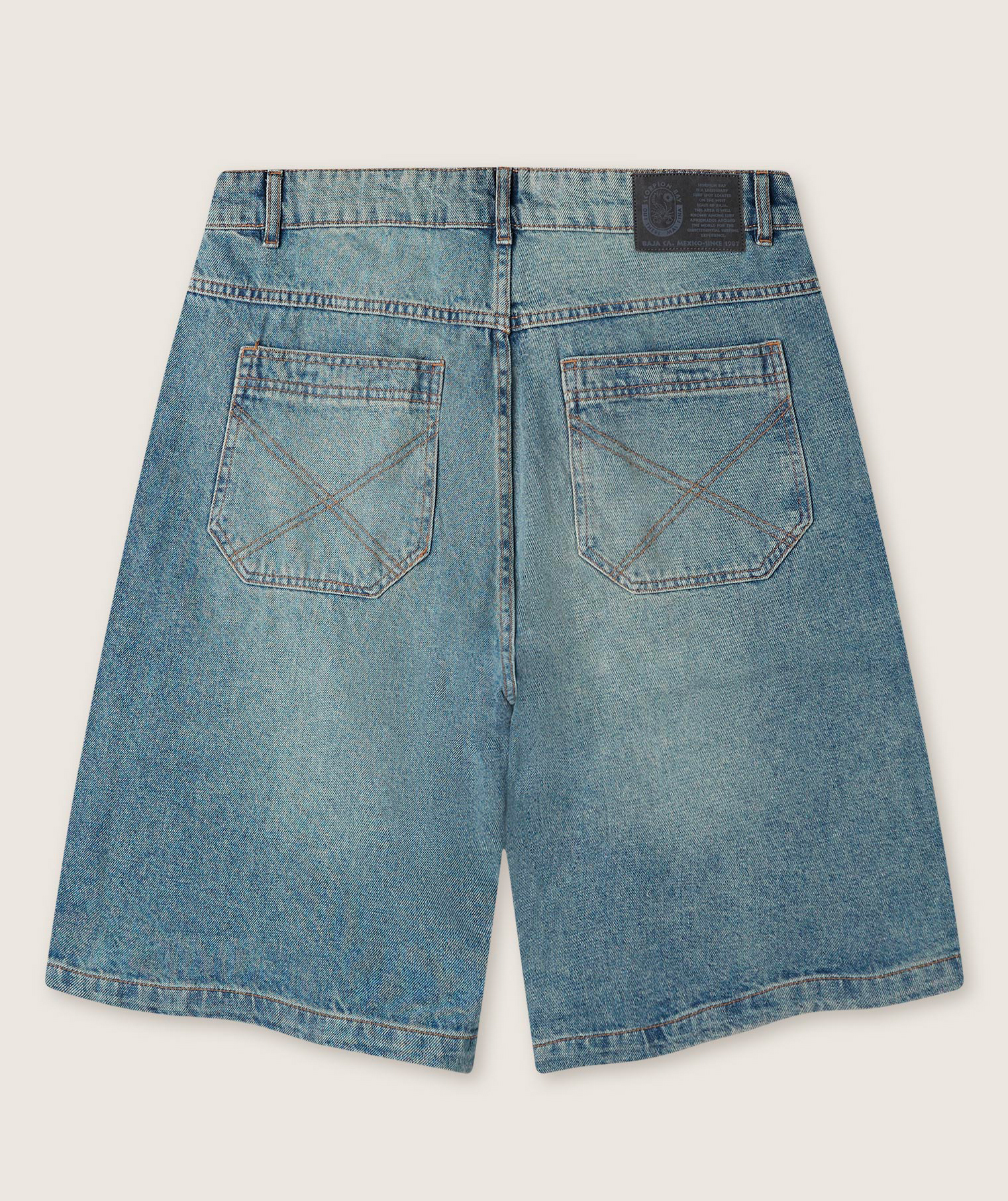 Men’s light denim bermuda shorts with a low-rise waist. 5-pocket design. Original ’90s-inspired fit. Stitching detail on back pockets. Custom label on the back.