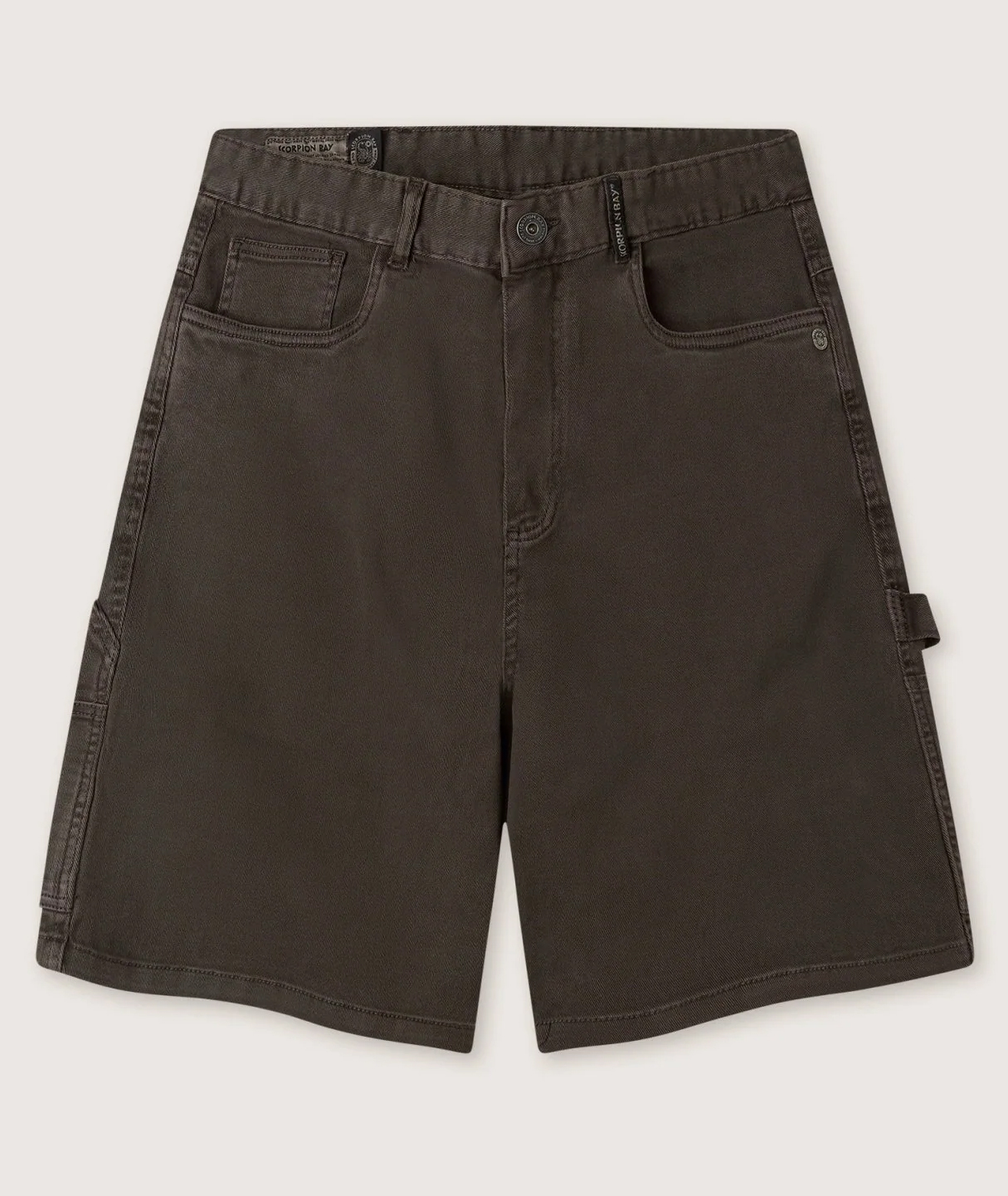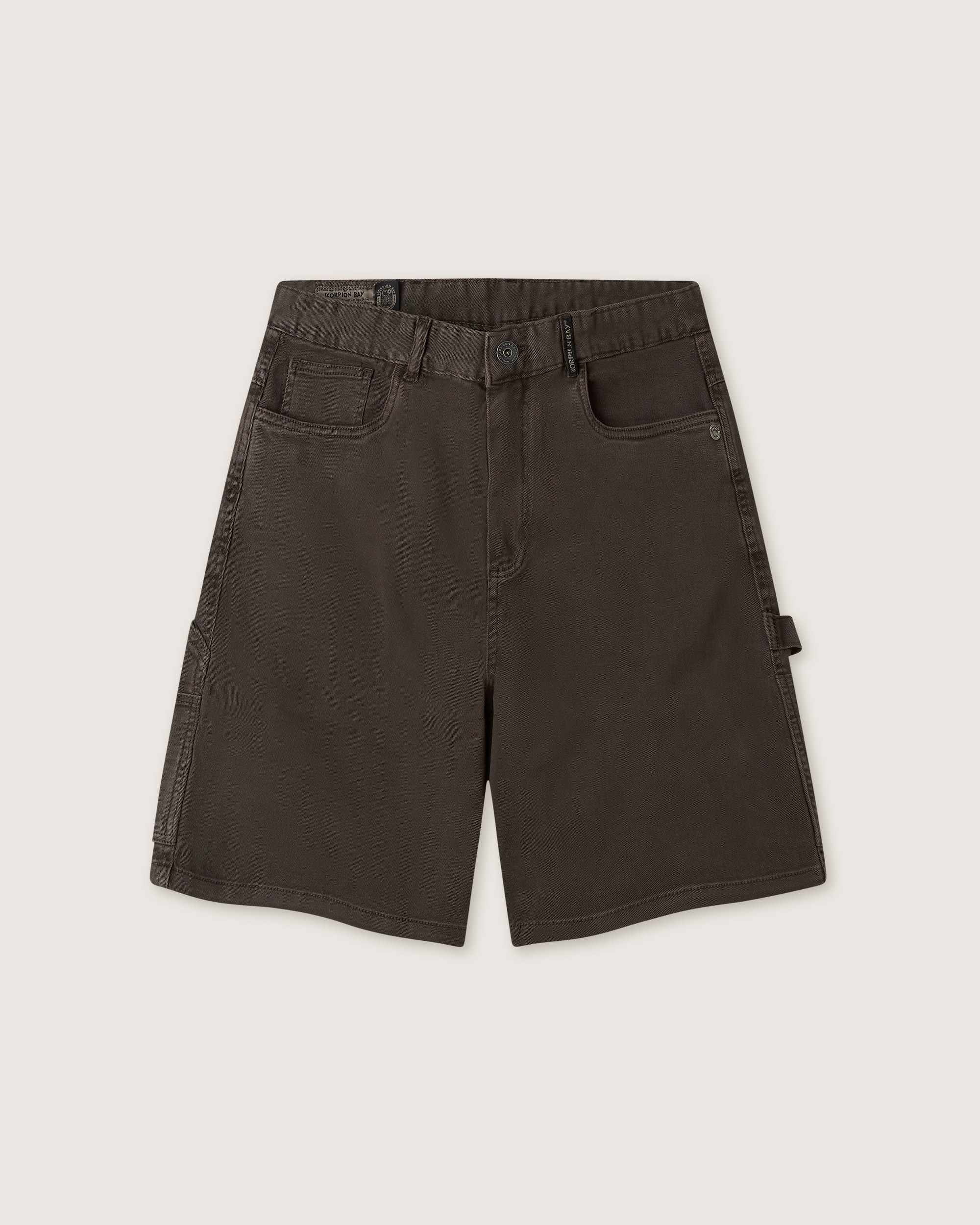 Men’s oversized carpenter bermuda shorts in espresso brown. Classic closure, carpenter-style utility pockets on the sides and double back pockets. Vintage effect achieved through washing.