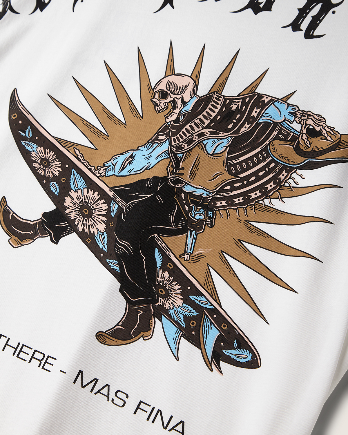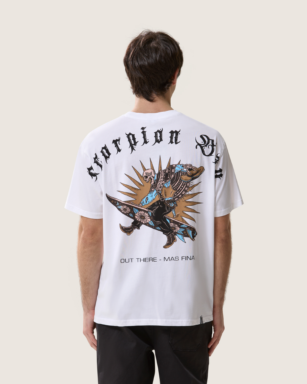 Men’s printed T-shirt in white. Graphic cowboy skeleton on a surfboard print on the back, with scorpion and lettering on the chest.