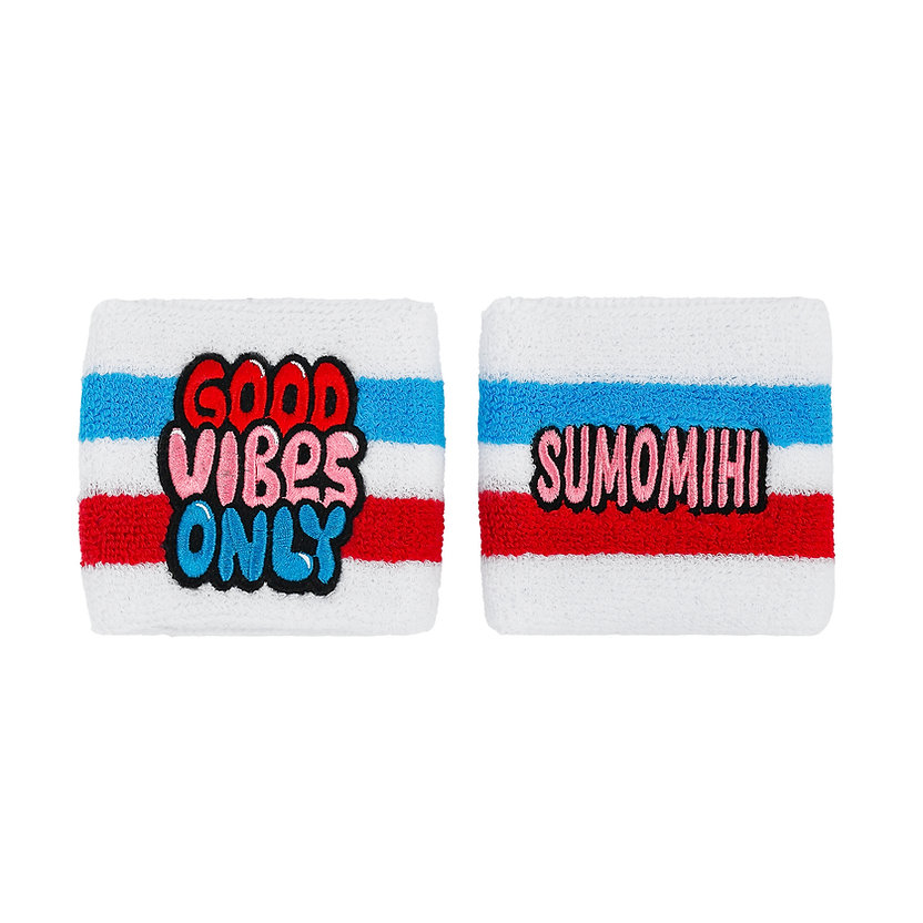 SUMOMIHI terry wristband. White color, “GOOD VIBES ONLY” lettering on the front, “SUMOMIHI” lettering on the back.